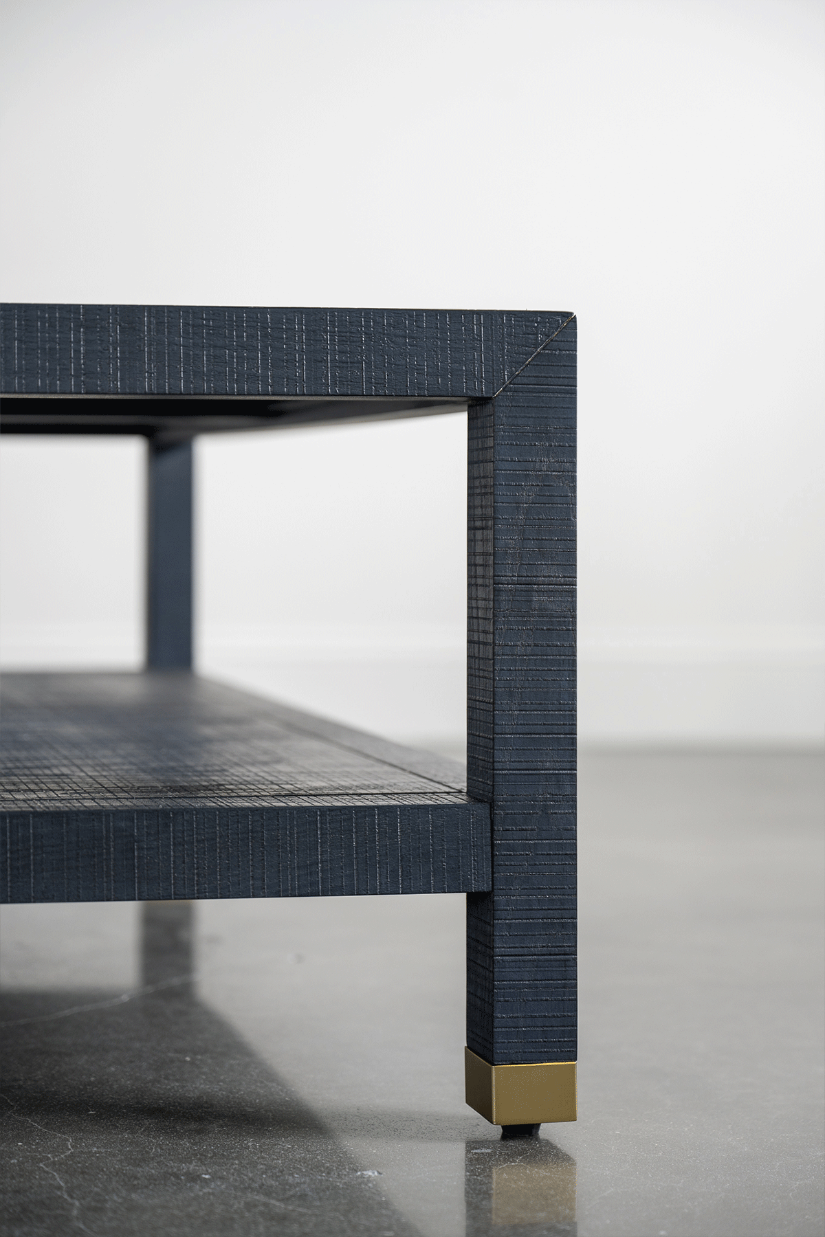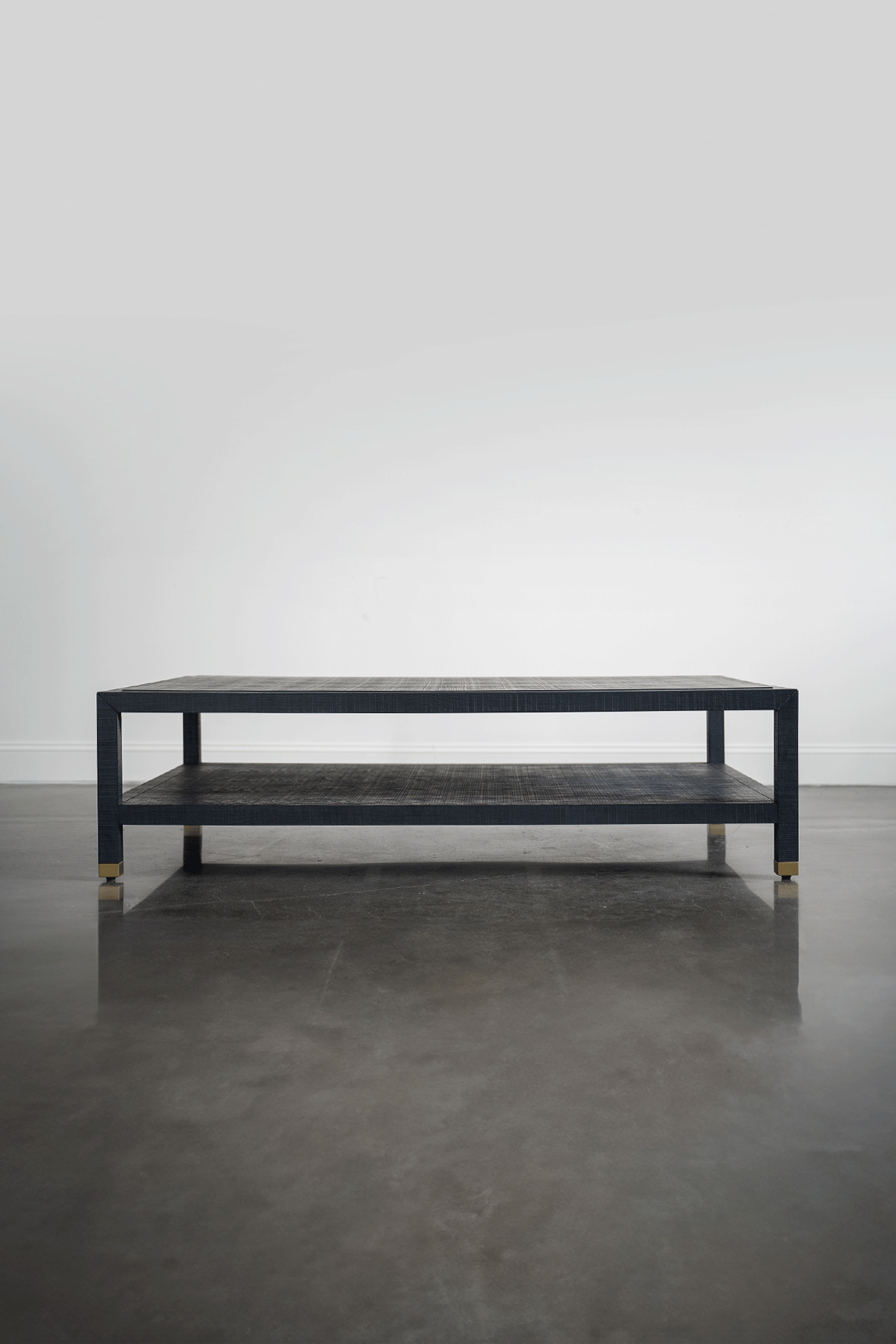 The grandly scaled coffee table is pure practical elegance in a denim blue finish. Its timeless design creates a getaway aesthetic that pivots easily from penthouse to farmhouse, mountain lodge to desert retreat. Its legs are capped in subtle matte brass to add a subtle gleam and modern finish.